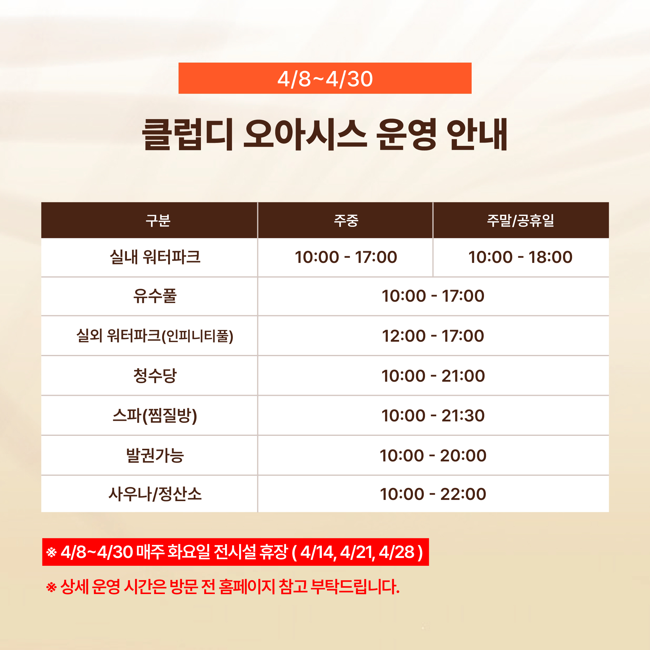 매주 화요일 및 4월 1일 전체휴장, 3월 23일~4월7일 워터파크 휴장
